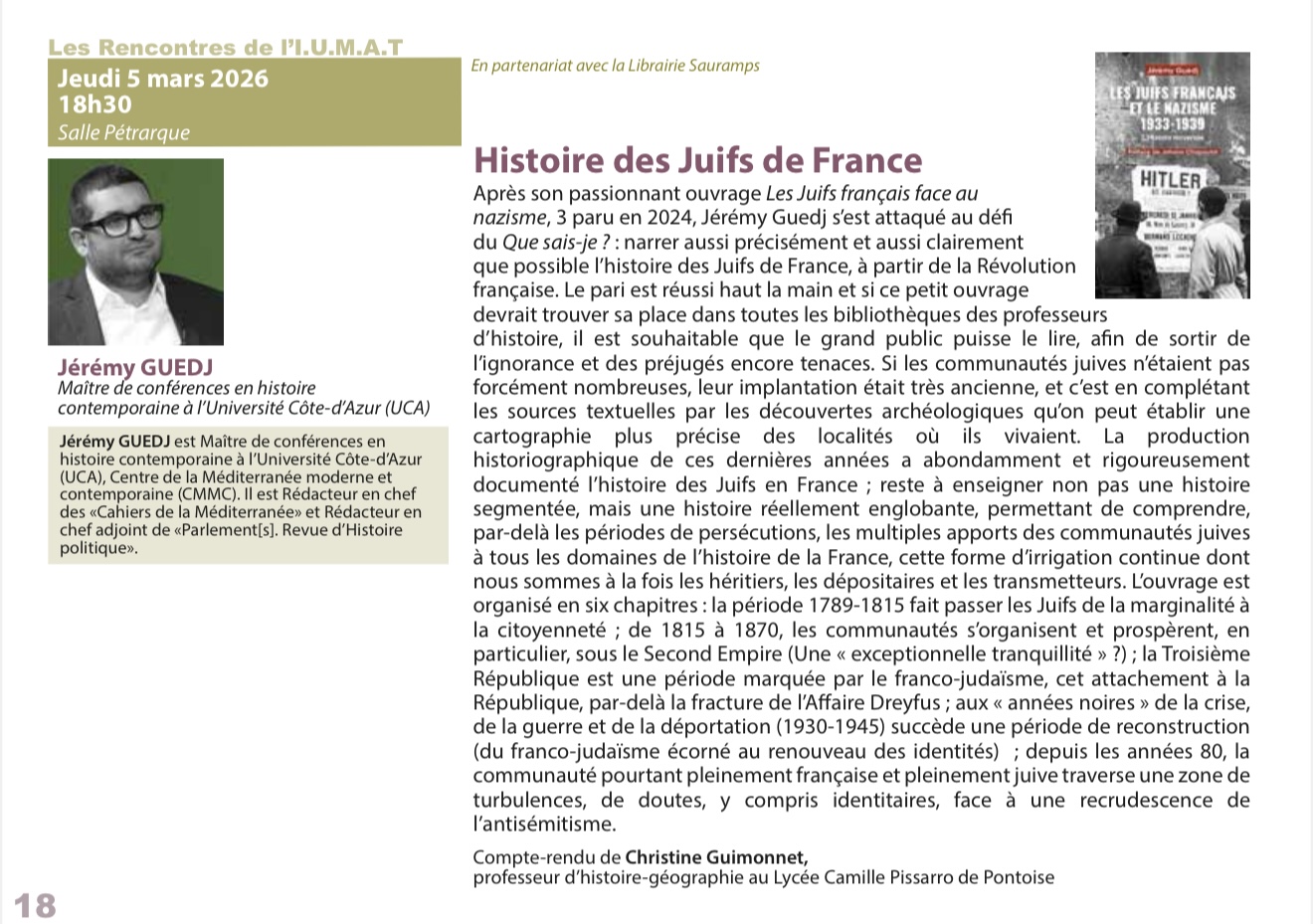 « Après son passionnant ouvrage Les Juifs français face au nazisme, paru en 2024, Jérémy Guedj s’est attaqué au défi du Que sais-je ? : narrer aussi précisément et aussi clairement que possible l’histoire des Juifs de France, à partir de la Révolution française. Le pari est réussi haut la main et si ce petit ouvrage devrait trouver sa place dans toutes les bibliothèques des professeurs d’histoire, il est souhaitable que le grand public puisse le lire, afin de sortir de l’ignorance et des préjugés encore tenaces. Si les communautés juives n’étaient pas forcément nombreuses, leur implantation était très ancienne, et c’est en complétant les sources textuelles par les découvertes archéologiques qu’on peut établir une cartographie plus précise des localités où ils vivaient. La production historiographique de ces dernières années a abondamment et rigoureusement documenté l’histoire des Juifs en France ; reste à enseigner non pas une histoire segmentée, mais une histoire réellement englobante, permettant de comprendre, par-delà les périodes de persécutions, les multiples apports des communautés juives à tous les domaines de l’histoire de la France, cette forme d’irrigation continue dont nous sommes à la fois les héritiers, les dépositaires et les transmetteurs. L’ouvrage est organisé en six chapitres : la période 1789-1815 fait passer les Juifs de la marginalité à la citoyenneté ; de1815 à 1870, les communautés s’organisent et prospèrent, en particulier, sous le Second Empire (Une « exceptionnelle tranquillité » ?) ; la Troisième République est une période marquée par le franco-judaïsme, cet attachement à la République, par-delà la fracture de l’Affaire Dreyfus ; aux « années noires » de la crise, de la guerre et de la déportation (1930-1945) succède une période de reconstruction (du franco-judaïsme écorné au renouveau des identités) ; depuis les années 80, la communauté pourtant pleinement française et pleinement juive traverse une zone de turbulences, de doutes, y compris identitaires, face à une recrudescence de l’antisémitisme. » Compte-rendu de Christine Guimonnet, professeur d’histoire-géographie au Lycée Camille Pissarro de Pontoise.