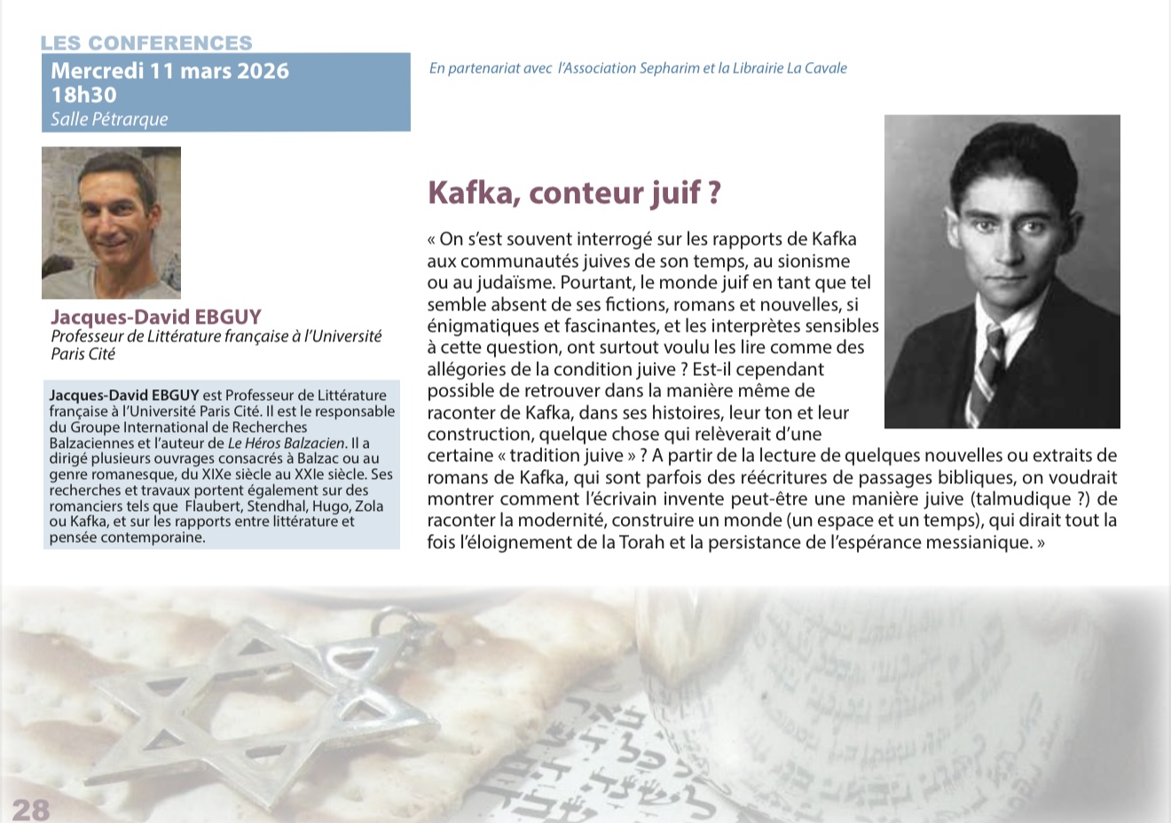 « On s’est souvent interrogé sur les rapports de Kafka aux communautés juives de son temps, au sionisme ou au judaïsme. Pourtant, le monde juif en tant que tel semble absent de ses fictions, romans et nouvelles, si énigmatiques et fascinantes, et les interprètes sensibles à cette question, ont surtout voulu les lire comme des allégories de la condition juive ? Est-il cependant possible de retrouver dans la manière même de raconter de Kafka, dans ses histoires, leur ton et leur construction, quelque chose qui relèverait d’une certaine « tradition juive » ? A partir de la lecture de quelques nouvelles ou extraits de romans de Kafka, qui sont parfois des réécritures de passages bibliques, on voudrait montrer comment l’écrivain invente peut-être une manière juive (talmudique ?) de raconter la modernité, construit un monde (un espace et un temps), qui dirait tout la fois l’éloignement de la Torah et la persistance de l’espérance messianique. »