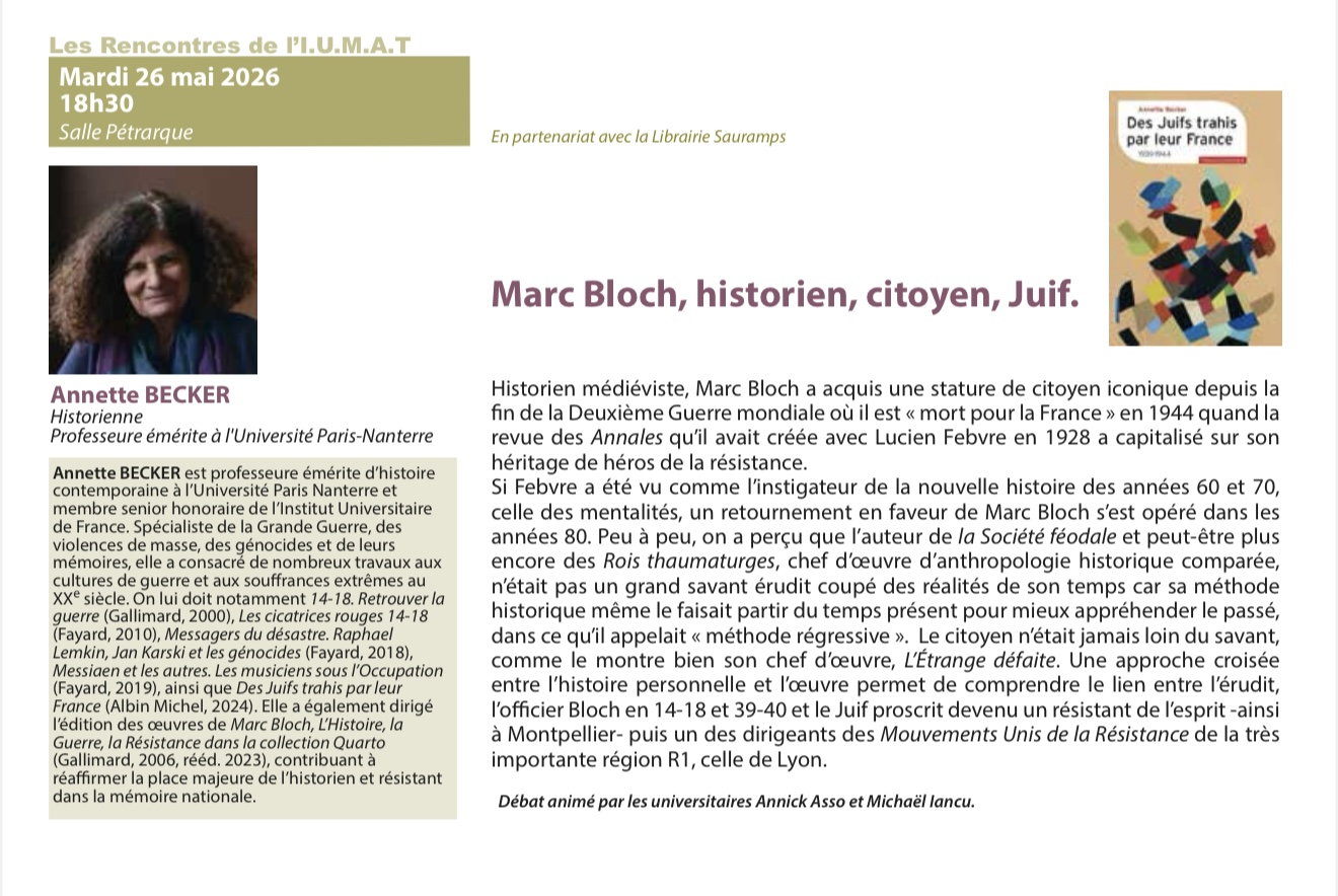 Si Febvre a été vu comme l’instigateur de la nouvelle histoire des années 60 et 70, celle des mentalités, un retournement en faveur de Marc Bloch s’est opéré dans les années 80. Peu à peu, on a perçu que l’auteur de la Société féodale et peut-être plus encore des Rois thaumaturges, chef d’œuvre d’anthropologie historique comparée, n’était pas un grand savant érudit coupé des réalités de son temps car sa méthode historique même le faisait partir du temps présent pour mieux appréhender le passé, dans ce qu’il appelait «méthode régressive». Le citoyen n’était jamais loin du savant, comme le montre bien son chef d’œuvre, L’Étrange défaite. Une approche croisée entre l’histoire personnelle et l’œuvre permet de comprendre le lien entre l’érudit, l’officier Bloch en 14-18 et 39-40 et le Juif proscrit devenu un résistant de l’esprit -ainsi à Montpellier- puis un des dirigeants des Mouvements Unis de la Résistance de la très importante région R1, celle de Lyon.
